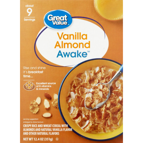 Awake Vanilla Almond Cereal: Rice and wheat flakes with almonds and vanilla flavor