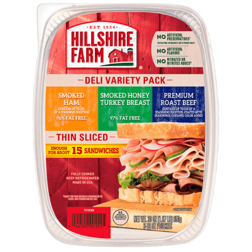 Smoked Ham, Contains Up To 28% of a Seasoning Solution: Ham, Water, Vinegar*, Contains 2% Or Less: Salt, Dextrose, Sodium Phosphate, Natural Flavorings (Including Celery Juice Powder*), Sugar, Sea Salt, Citric Acid. *to preserve quality. Smoked Honey Turkey Breast: Turkey Breast, Turkey Broth, Honey, Modified Corn Starch, Vinegar*, Contains 2% Or Less: Salt, Sodium Phosphate, Natural Flavorings (Including Celery Juice Powder*), Carrageenan, Sea Salt. *to preserve quality. Roast Beef, Contains Up To 20% of a Flavoring Solution: Beef, Water, Vinegar, Contains 2% or Less: Beef Flavor, Maltodextrin, Salt, Sea Salt, Sodium Phosphate, Sugar.