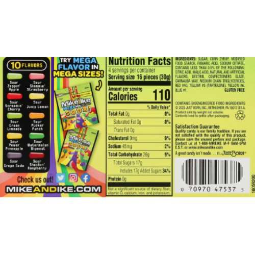 Sugar, Corn Syrup, Modified Food Starch, Fumaric Acid, Sodium Citrate, Contains Less Than 0.5% Of The Following: Citric Acid, Malic Acid, Natural And Artificial Flavors, Dextrin, Confectioners Glaze, Carnauba Wax, Medium Chain Triglycerides, Red 40, Yellow 5 (Tartrazine), Yellow 6, Blue 1.