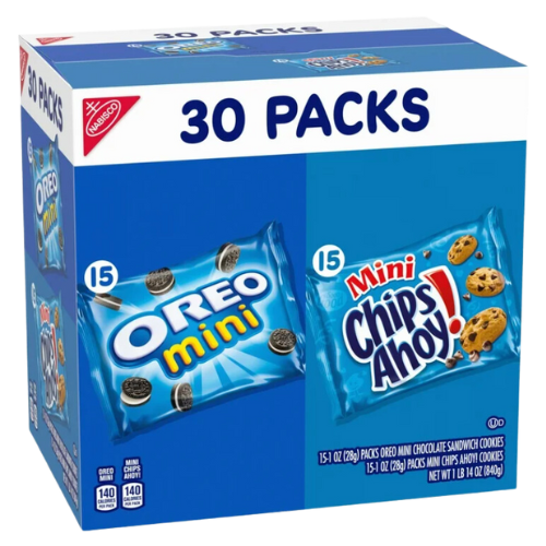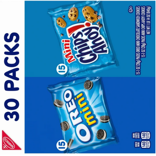 One Nabisco Cookie Variety Pack with 30 snack packs, including 15 OREO Mini and 15 CHIPS AHOY! Mini (packaging may vary)