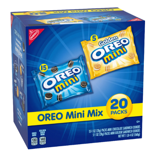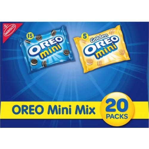 OREO Mini Mix Variety Pack Cookies are a delicious mix of Original and Golden OREO bite sized cookies. These mini cookies are the best of both worlds featuring both chocolate and golden varieties. OREO Minis are great for sharing, enjoying by the handful or topping ice cream. Mini OREO cookies are also great at lunch. Individually packed, these cookie snack packs are perfect for taking on the go.