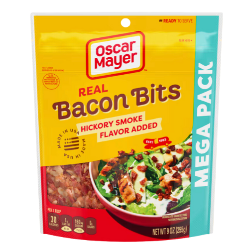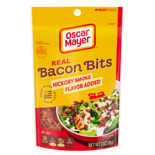 Everything is better with a bit of bacon. Oscar Mayer Real Bacon Bits with Hickory Smoke Flavor Added are made from real slices of Oscar Mayer pork bacon so you can easily add rich, smoky flavor to your favorite dishes. Convenient smoked bacon bits are just the right size to use as a topping or mix into recipes. Our classic hickory smoked bacon flavor adds a delicious new dimension to salads, baked potatoes and more. Try mixing our bacon bits into an omelet with a breakfast sausage for a fun variation of the classic bacon and eggs breakfast, or sprinkle them over pizza or pasta for added flavor. Our fully cooked bacon bits come in a convenient 3-ounce resealable bag to preserve flavor.
