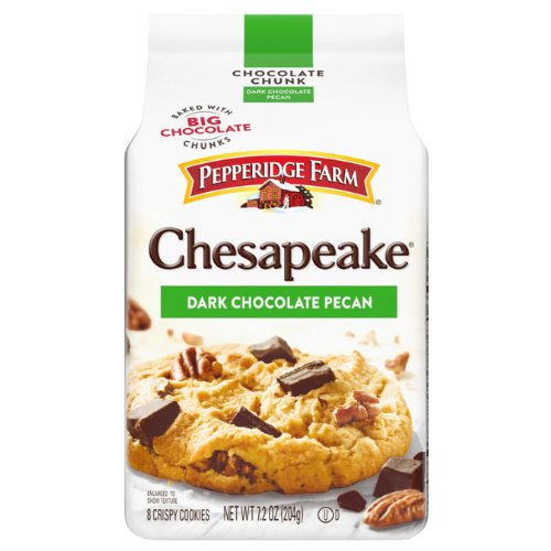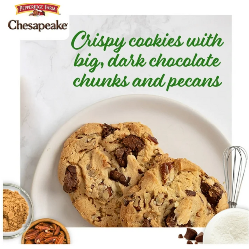 DARK CHOCOLATE CHUNK COOKIES: Pepperidge Farm Chesapeake Dark Chocolate Pecan Cookies are baked with an abundance of dark chocolate chunks and pecans