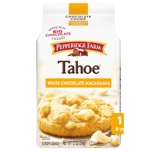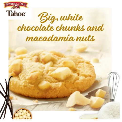 WHITE CHOCOLATE CHUNK COOKIES: Pepperidge Farm Tahoe White Chocolate Macadamia Nut Cookies are baked with white chocolate chunks and macadamia nuts