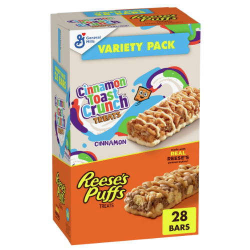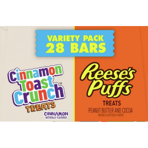 - VARIETY PACK: A portable snack perfect for the pantry, lunch box, and breakfast treat; Includes 14 Peanut Butter & Cocoa Reese's Puffs bars and 14 Cinnamon Toast Crunch bars